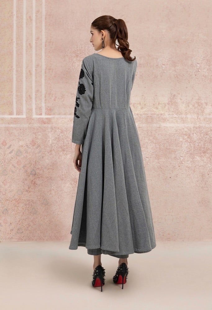 فستان انيق مفتوح من الأمام مع تطريز على الكتف والأكمام.